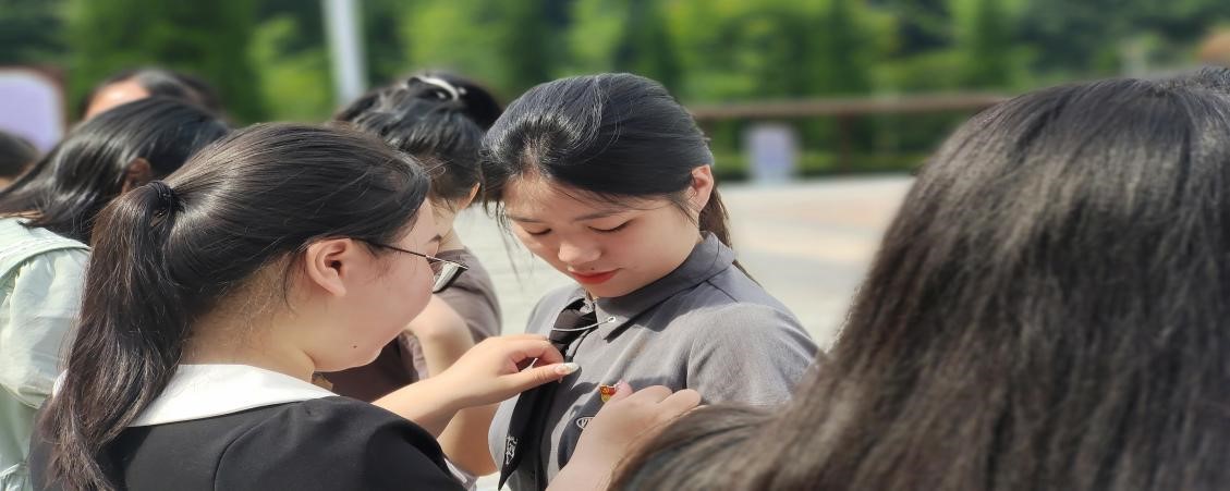 活动的第四阶段,毕业生党员代表为新接收党员佩戴党徽,并带领新接收党员面对党旗尊严宣誓,在党旗下接受心灵的洗礼。然后由毕业生党员代表龚彤彤发言寄语。以老带新,薪火相传,这是一种激励,是一种精神的传承,也是一种奋斗的延续。希望新老党员们通过这种“仪式感”亮明身份,增强党性观念和党员意识,牢记党员使命与担当。