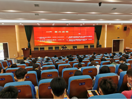 4月23日周六上午一二节课,董事长汤放华在图书馆报告厅为大二2008601,2009301,2009302班的员工讲授了一堂题为“百年奋斗重大成就和历史经验”的形势与政策课。
