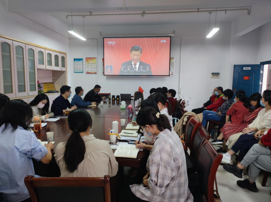 在收看过程中,老师们聚精会神听报告,全神贯注记笔记。一致认为,中国共产党第二十次全国代表大会,是在全党全国各族人民迈上全面建设社会主义现代化强国新征程、向第二个百年奋斗目标进军的关键时刻召开的一次十分重要的大会。立足百年大党新起点,接力百年奋斗新征程,我们要以习近平总书记的讲话为指引,坚持“集中力量办大事”的优势,认真履行岗位职责,做好本职工作,深入研究和回答我国发展和我们党执政面临的重大理论和实践问题,为坚持和发展中国特色社会主义、推进马克思主义中国化、时代化、大众化作出更大贡献。